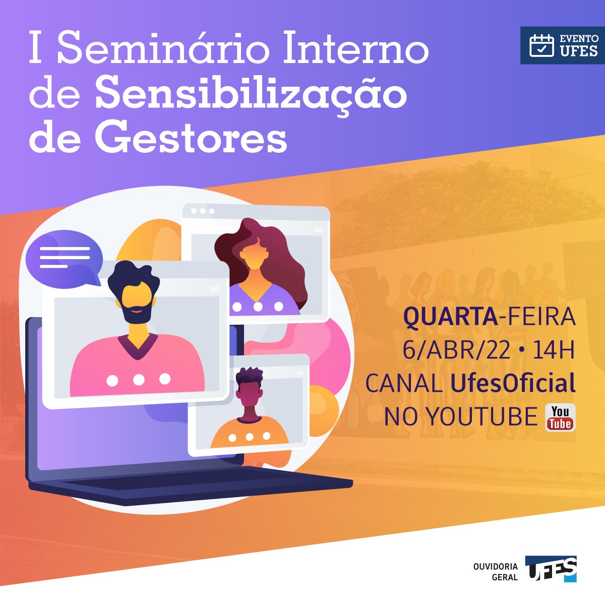 A Ouvidoria da Ufes realiza nesta quarta-feira, 6, das 14 às 17 horas, o 1º Seminário Interno de Sensibilização de Gestores, em formato totalmente virtual, com transmissão pelo canal oficial da universidade no YouTube. O objetivo do evento é esclarecer e capacitar os gestores e demais servidores para a atuação funcional com base na Lei de Acesso à Informação – Lei nº 12.527, de 18 de novembro de 2011.